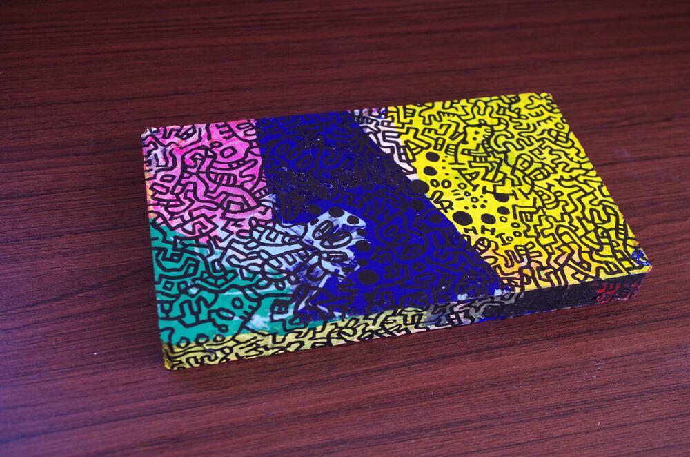 100× 177mm, Pen and acrylic, gouach, nail polish, varnish and modeling paste on waste wood 2016
