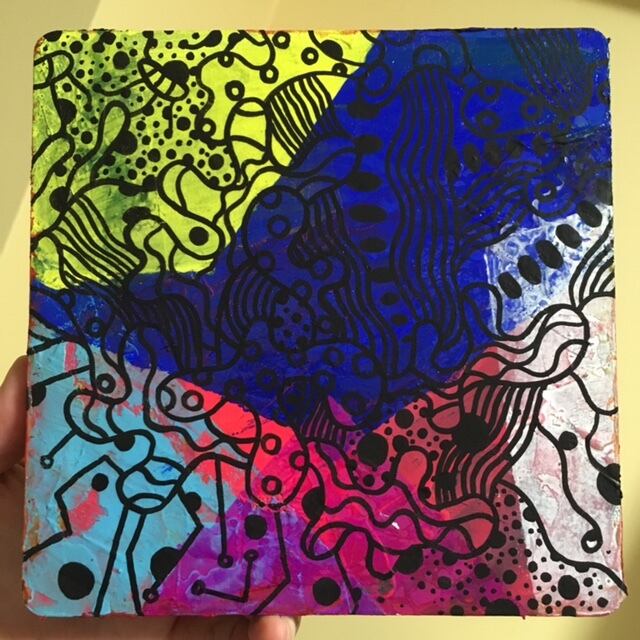 168×168mm, Pen and acrylic, gouach, nail polish, varnish and modeling paste on waste wood 2016